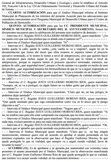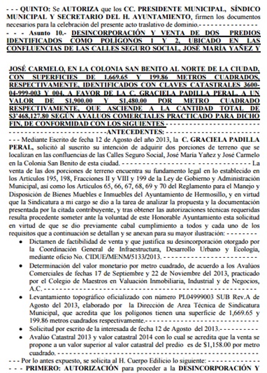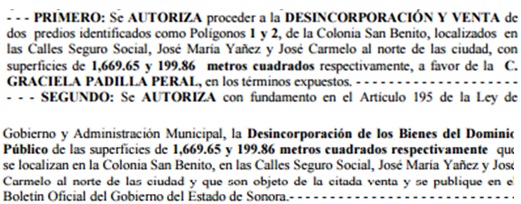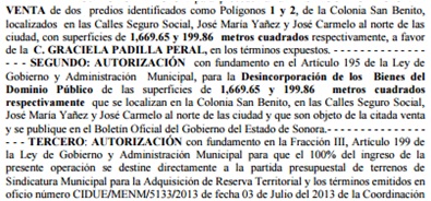 En el acta 32 de enero del 2014 se trató el tema de la venta de terrenos de equipamento, como la venta del parque de Cerrada Cucurpe y también un par de polígonos localizados frente al Panteón Yáñez. En ambos casos ha actuado la Fiscalía Anticorrupción de Sonora