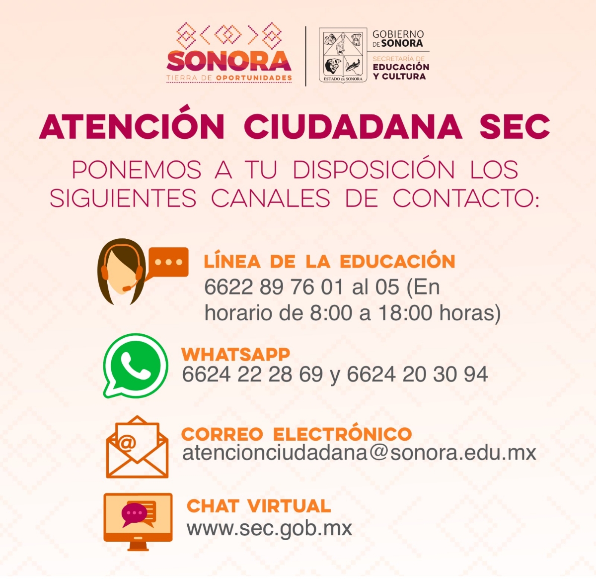 Hermosillo, Sonora; 27 de agosto de 2023.- Para atender peticiones y reportes de la comunidad educativa, durante el arranque del ciclo escolar 2023-2024, el Gobierno de Sonora, a través de la Secretaría de Educación y Cultura (SEC), reforzará los mecanismos de atención ciudadana con los que cuenta.